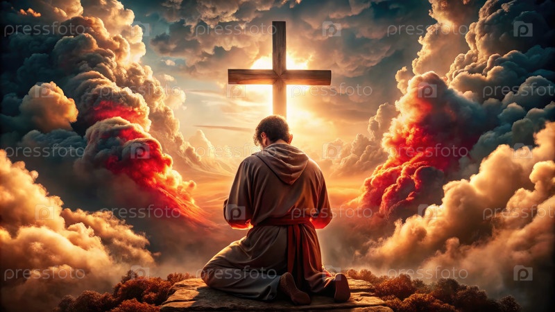 Человек, молящийся в силуэте перед крестом на закате солнца в спокойном пейзаже