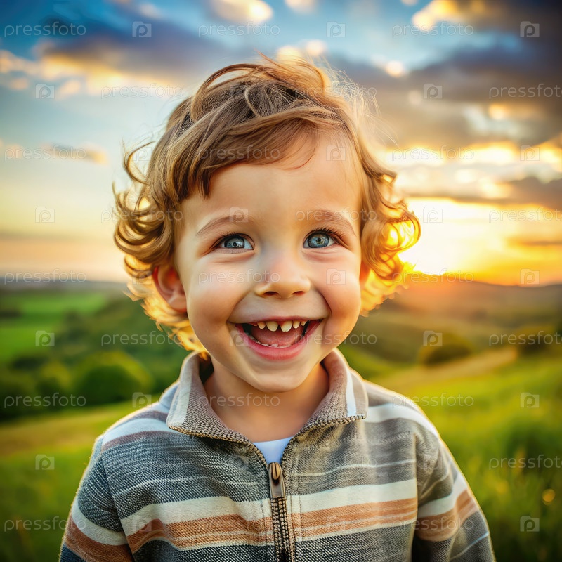 Ребенок радостно улыбается на закате в пышно-зеленом пейзаже