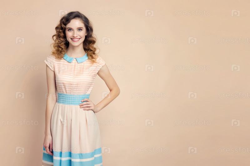 Улыбающийся хипстер в сине-розовом платье позирует в студии
