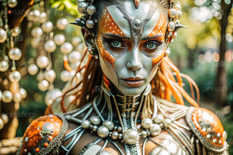 Эфирная киберготская мода расы, вдохновленной инопланетянами, в лесной обстановке