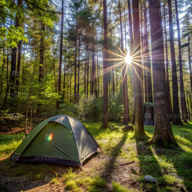 Солнечный свет фильтрует сквозь деревья, освещая палату для кемпинга в тихом лесу