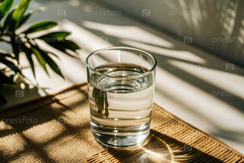 Стакан холодной воды, сидящий на текстурированном коврике с мягким естественным освещением днем