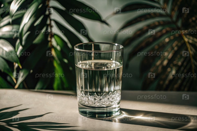 Кристально чистый стакан холодной воды лежит на столе, окруженном растениями