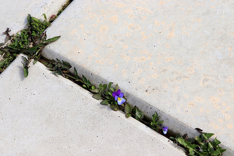 Не забудь меня цветок на каменной дороге среди бетонных плит.Концепция рождения новой жизни и прихода весны, выживания растений в суровых условиях, абстрактный цветочный фон
