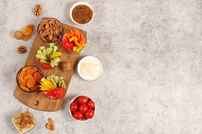 Средневосточная тарелка, Здоровая еда Кулинария фонарь с миской хумуса и сырыми овощными палочками, орехами и сушеными абрикосами