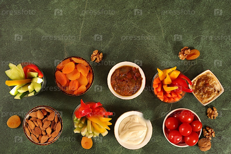 Средневосточная тарелка, Здоровая еда кулинария фонарь с миской хумуса и сырыми овощными палочками, орехами и сушеными абрикосами. Hummus-тарелка с закусками, традиционные веганские перекусы, концепция восточной кухни