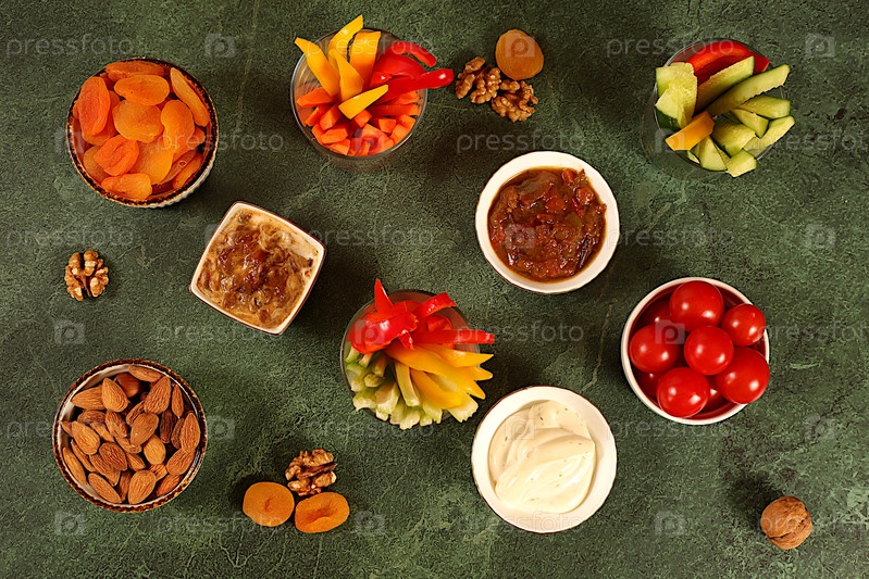 Восточная кухня и концепция здоровых закусок, Здоровая еда кухонный фон с миской хумуса и сырыми овощными палочками, орехами и сушеными абрикосами. Тарелка гумуса с аппетитами, традиционные веганские перекусы