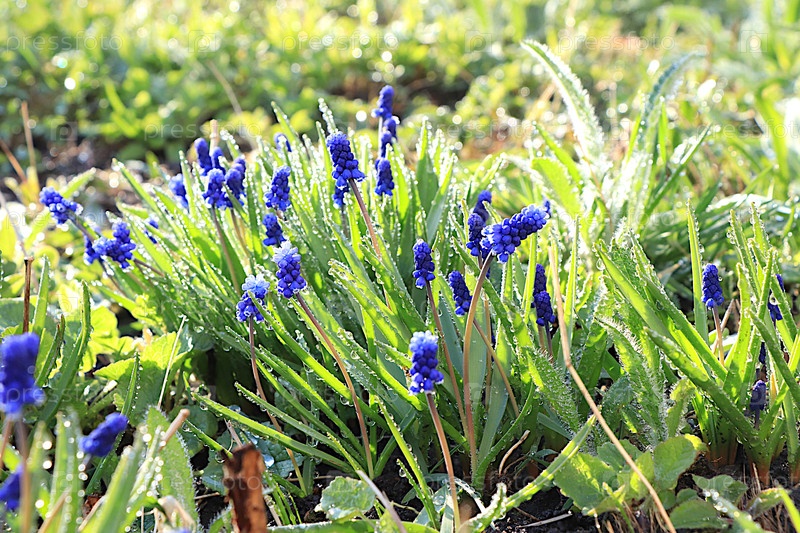 Абстрактный цветочный фон с размытым фоном и эффектом боке. Деликатные первые побеги мускари с капельками росы после дождя в весеннем саду. Концепция прибытия весны, цветовая карточка, шаблон дизайна