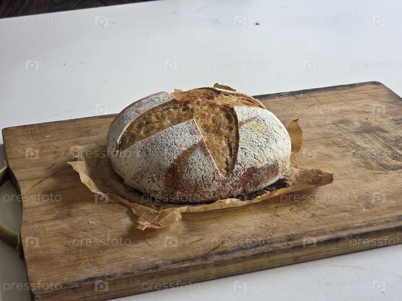 На деревянной разделочной доске лежит буханка хлеба с надрезами. Хлеб покрыт белой и коричневой корочкой
