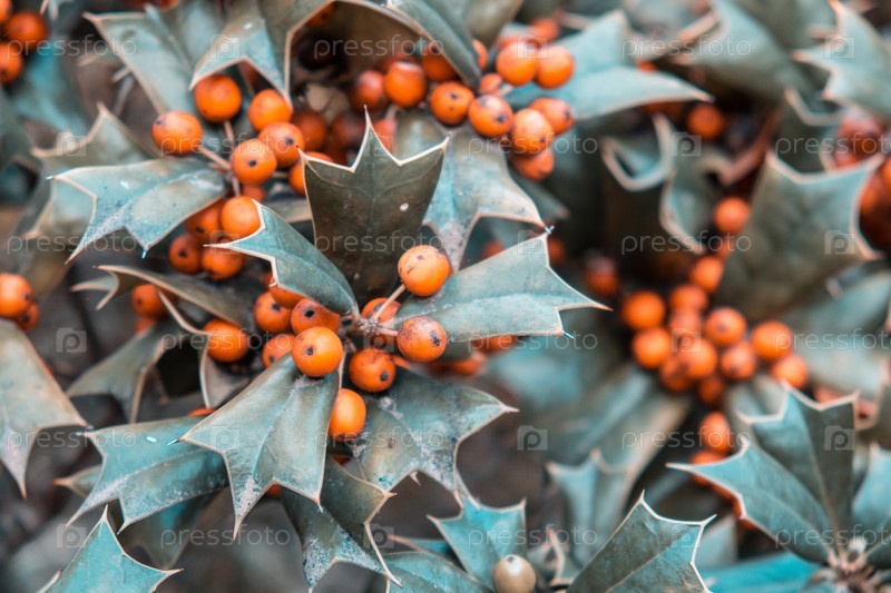 Падуб с оранжевыми ягодами, крупный план