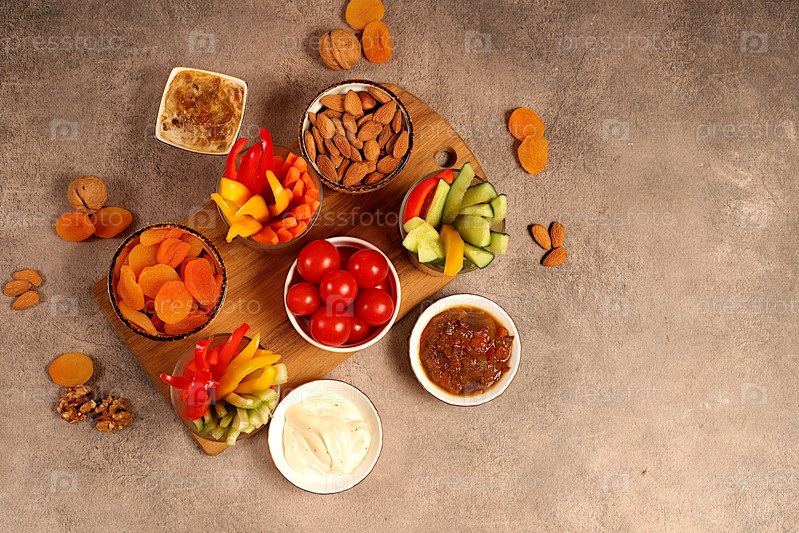 Здоровый кухонный фон с миской для хумуса и сырыми овощными палочками, орехами и сушеными абрикосами. плита гумуса с закусками, блюдо Ближнего Востока, традиционные веганские перекусы,