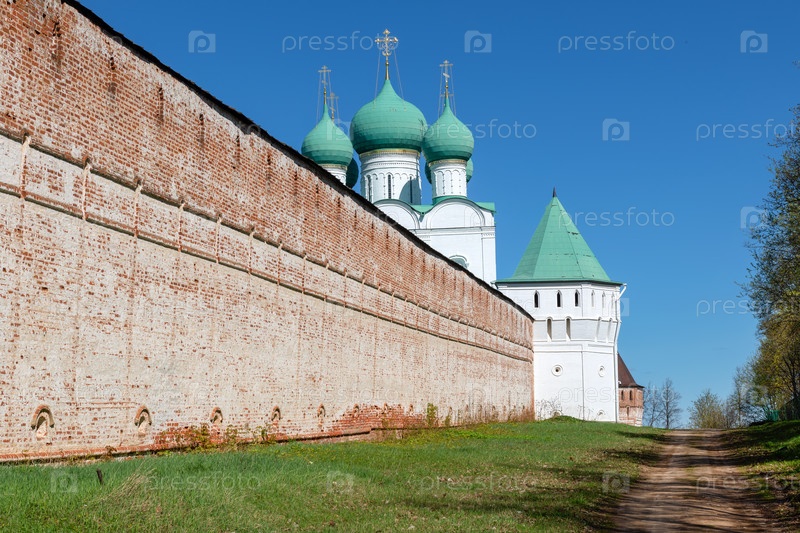 Южные ворота и Церковь Сергия Радонежского в Борисоглебском мужском монастыре. Ярославская область, поселок городского типа Борисоглебский