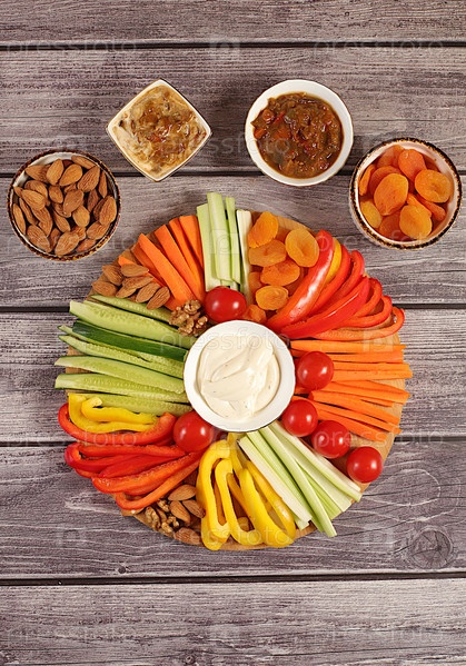 Тарелка хумуса с закусками, здоровый кулинарный фон кухни с миской для хумуса и сырыми овощными палочками, орехами и сушеными абрикосами. блюдо Ближнего Востока, традиционные веганские аппетиты,