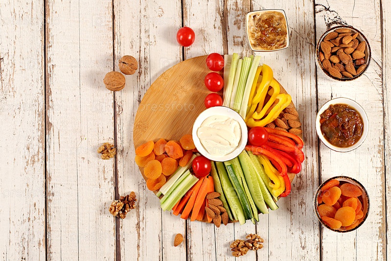 Здоровый кухонный фон с миской для хумуса и сырыми овощными палочками, орехами и сушеными абрикосами. плита гумуса с закусками, блюдо Ближнего Востока, традиционные веганские перекусы,