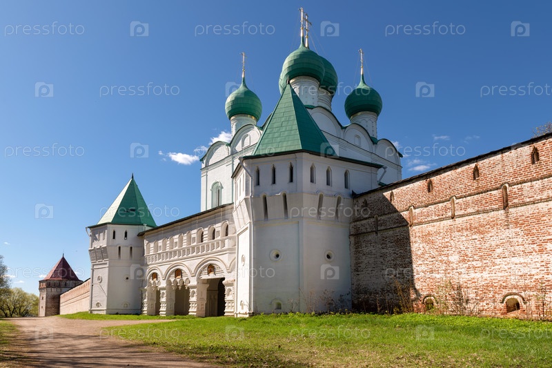 Южные ворота и Церковь Сергия Радонежского в Борисоглебском мужском монастыре. Ярославская область, поселок городского типа Борисоглебский