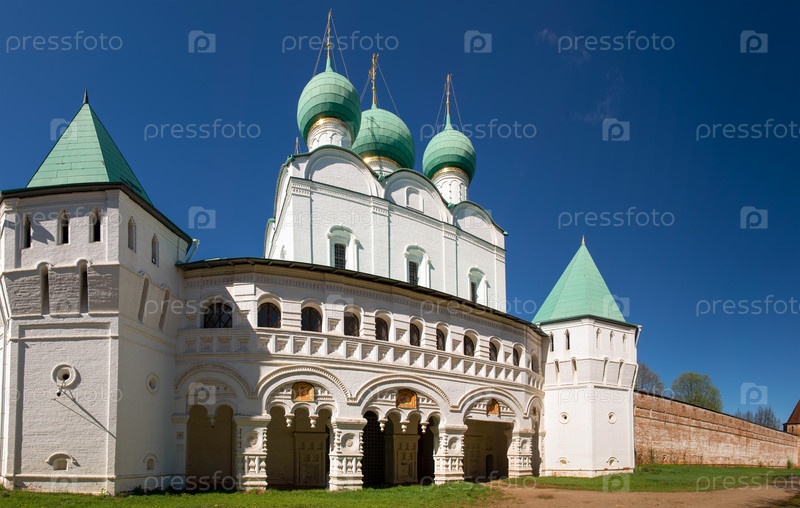 Южные ворота и Церковь Сергия Радонежского в Борисоглебском мужском монастыре. Ярославская область, поселок городского типа Борисоглебский