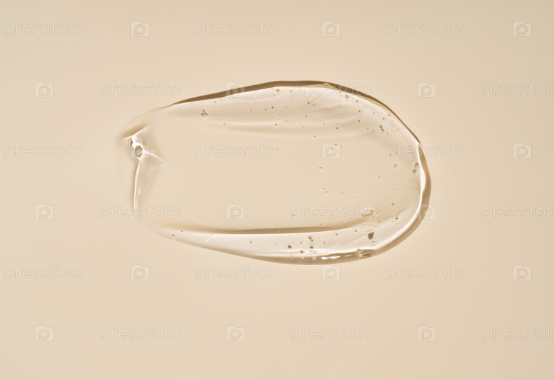 Овальный прозрачный косметический гель на бежевом фоне.Чистый жидкий сывороточный мазок с копировальным пространством
