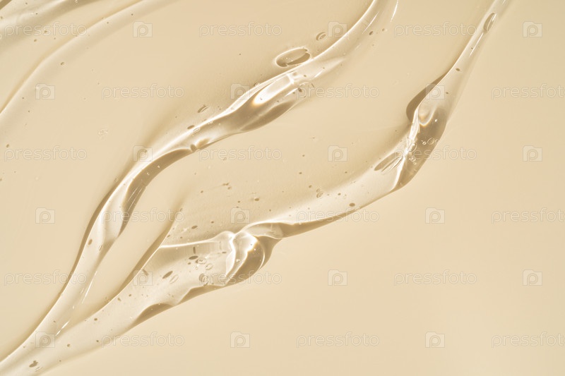 Ближайший снимок бежевого жидкого косметического геля или сывороточного макияжа с глянцевой, блестящей текстурой на гладном бежевом фоне
