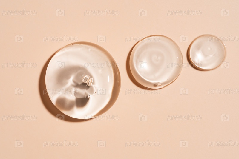 Макро-верхний вид трех круговых прозрачных капель геля на гладком бежевом фоне. Профессиональные образцы косметической текстуры для трёхэтапной рутины ухода за кожей, сыворотки для увлажнения или роскошного брендинга красоты. Минималистская компоновка с м