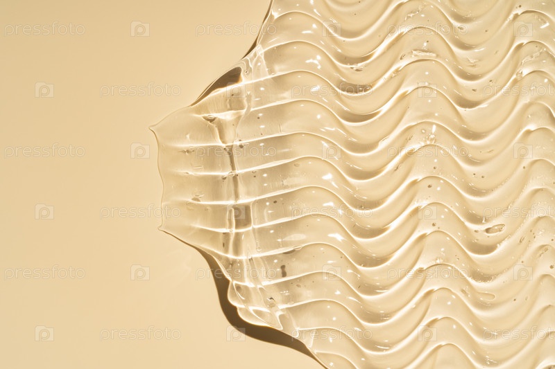 Макро-верхний вид мелкой прозрачной гелевой текстуры на золотисто-бежевом фоне. Профессиональный волнистый образец для парикмахерского желе, гидратирующей маски лица или скульптурной сыворотки. Минималистская эстетическая компоновка с копировальным простр