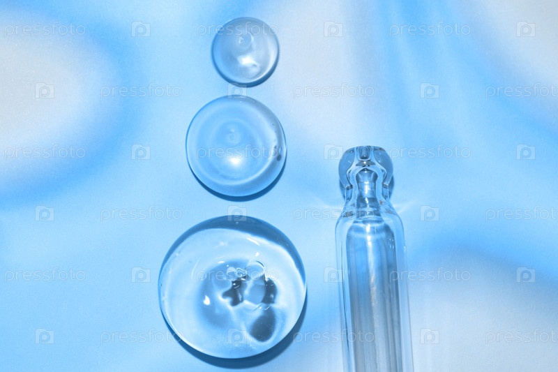 Вид сверху трех прозрачных капель геля и стеклянной пипетты на светло-синем фоне с мягкими водяными рябцами. Профессиональные косметические образцы для гидратации сыворотки, аквагеля или презентации дерматологических продуктов. Свежая минималистическая ко