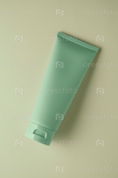 Вид сверху на пустую мятно-зеленую пластиковую кремную трубку на соответствующей зеленой поверхности.Минималистский макет упаковки по уходу за кожей для продуктов красоты и органической косметики