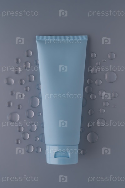 Вид сверху на пустую голубую пластиковую кремную трубку, окруженную капельками прозрачной воды на гладкой серой поверхности.Минималистский макет упаковки по уходу за кожей для увлажняющих продуктов