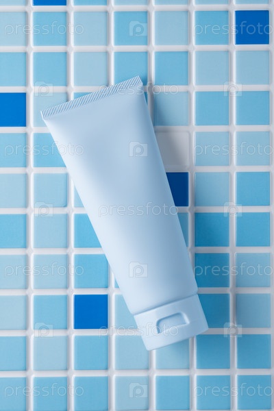 Вид сверху пустой светло-синей пластиковой трубы на соответствующей поверхности голубой мозаичной плитки.Минималистский макет упаковки по уходу за кожей для ванной комнаты, душа или спа-продуктов
