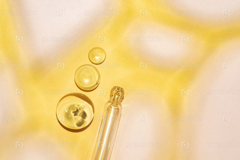 Стеклянная пипетка и три золотые капли жидкости. Профессиональные образцы косметической текстуры для сыворотки витамина C, масла для лица или презентации солнцезащитных продуктов. Яркая концепция под солнечным светом для брендинга по уходу за кожей, индус