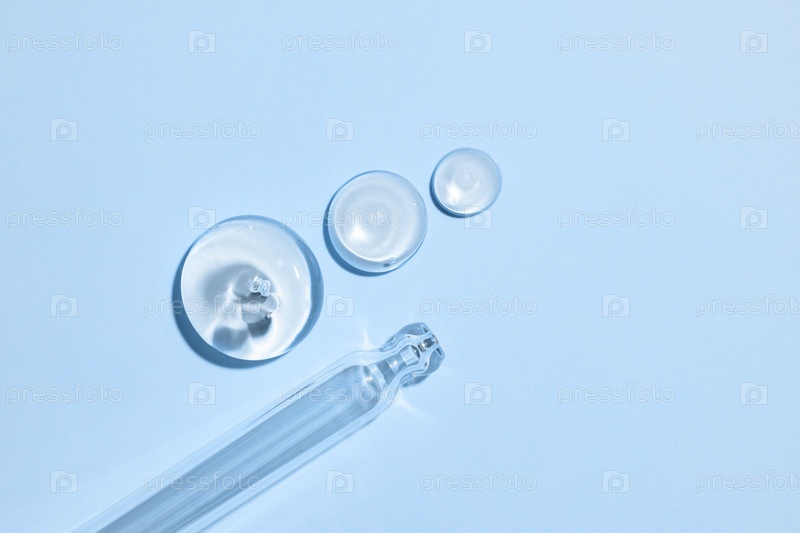 Стеклянная пипетка и три прозрачных капли геля на светло-синем фоне Профессиональные косметические образцы для гидратации сыворотки, гиалуроновой кислоты или презентации дерматологических продуктов Лабораторная концепция брендинга и красоты по уходу за ко