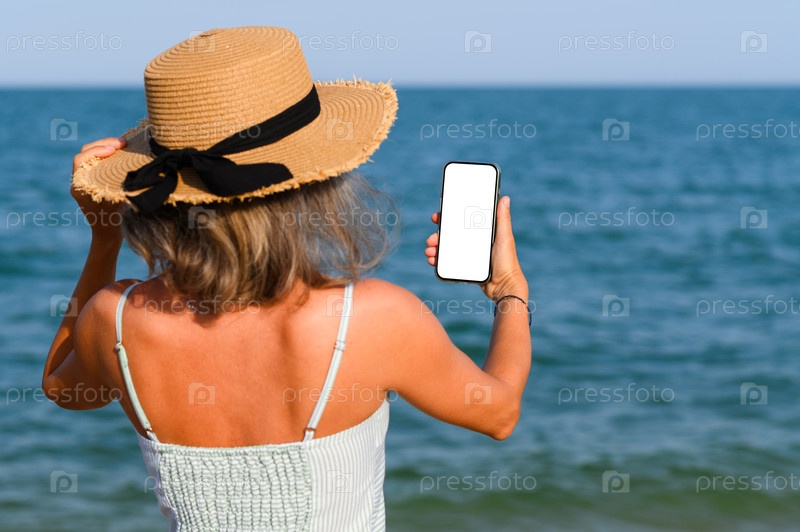 Молодая девушка в шляпе у моря держит телефон, на котором белый экран