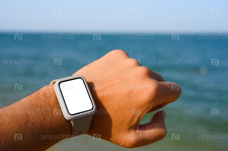 Электронные часы с белым дисплеем на фоне моря.Активный отдых и современный гаджет