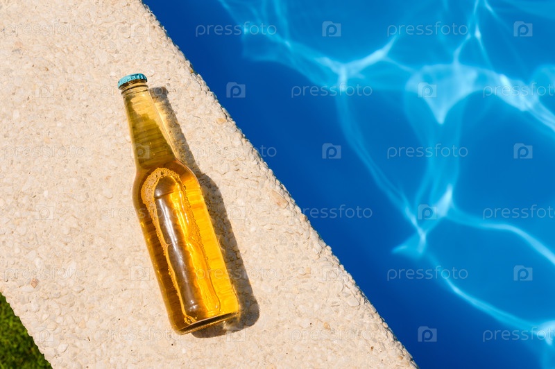 Бутылка с напитком возле бассейна. бутылка легкого пива рядом с бассейном отеля. вид сверху