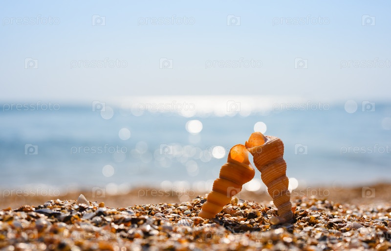 Две маленькие ракушки на берегу моря. Близкий план. Морской пейзаж и дикая природа