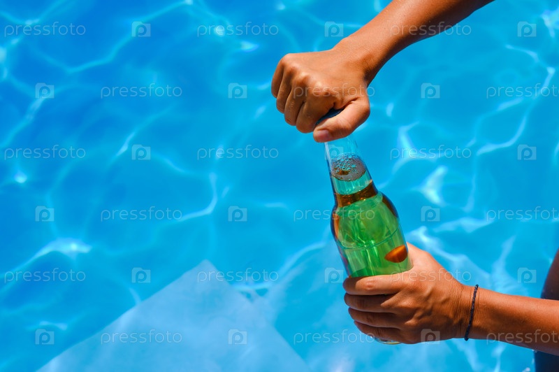 Бутылка холодного пива в руках у бассейна.Девушка открывает напиток в гостиничном бассейне