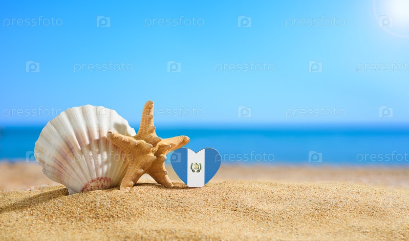 Флаг Гватемалы в форме сердца и ракушки на песчаном пляже