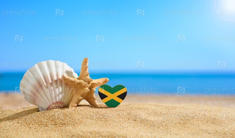 Флаг Ямайки в форме сердца и ракушки на песчаном пляже