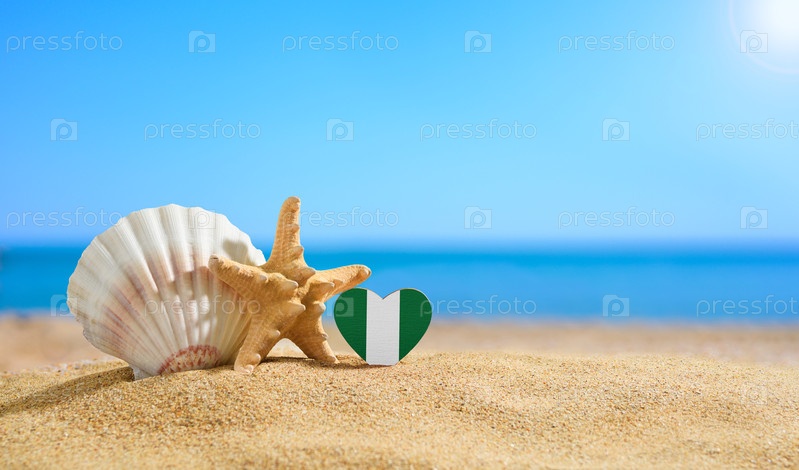 Флаг Нигерии в форме сердца и ракушки на песчаном пляже