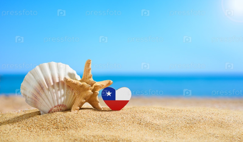 Чилийский флаг в форме сердца и моллюски на песчаном пляже