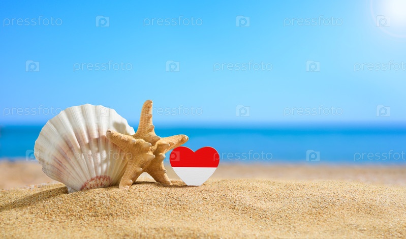 Флаг Индонезии в форме сердца и ракушки на песчаном пляже
