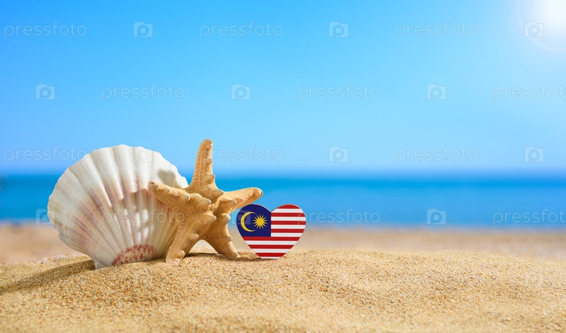 Флаг Малайзии в форме сердца и ракушки на песчаном пляже