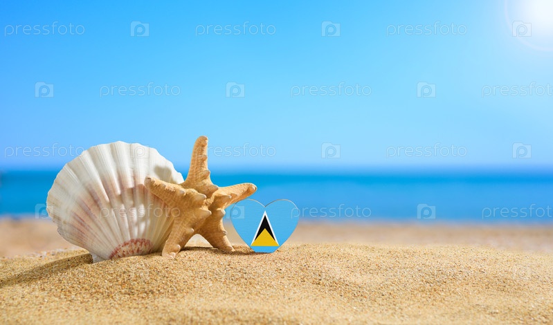 Флаг Святой Люсии в форме сердца и ракушки на песчаном пляже
