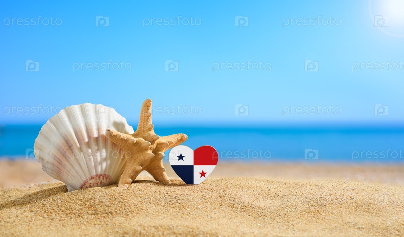 Флаг Панамы в форме сердца и ракушки на песчаном пляже