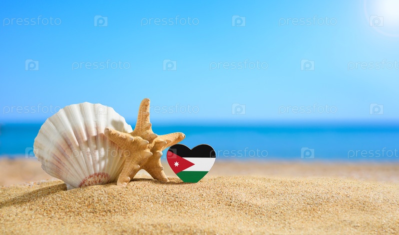 Флаг Иордании в форме сердца и ракушки на песчаном пляже