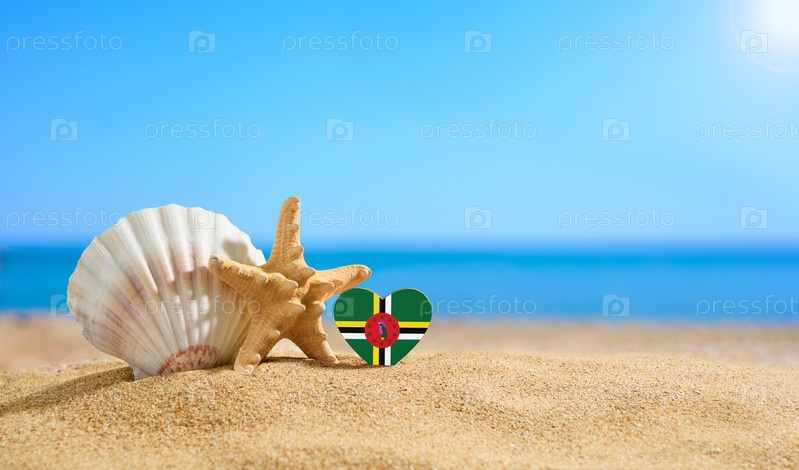 Флаг Доминики в форме сердца и ракушки на песчаном пляже