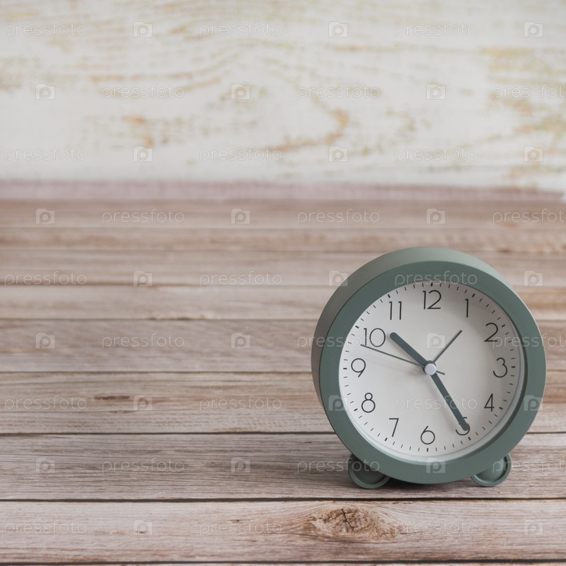 Круглый будильник в винтажном стиле сальфийского зеленого цвета стоит на светло-коричневой деревянной поверхности.Фон - текстурированная, выветрившаяся белая деревянная стена, создающая уютную, минималистическую и спокойную атмосферу.Идеально подходит для