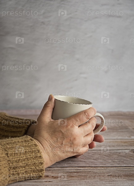Близкий план морщинистых рук пожилой женщины, держащей бежевую керамическую кружку. Она носит вязанный свитер горчичного цвета и опирается на деревянный стол против текстурированной серой стены. Изображение передает ощущение одиночества, созерцания и тепл