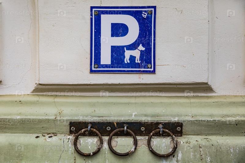 Синий знак парковки с символом собаки на стене