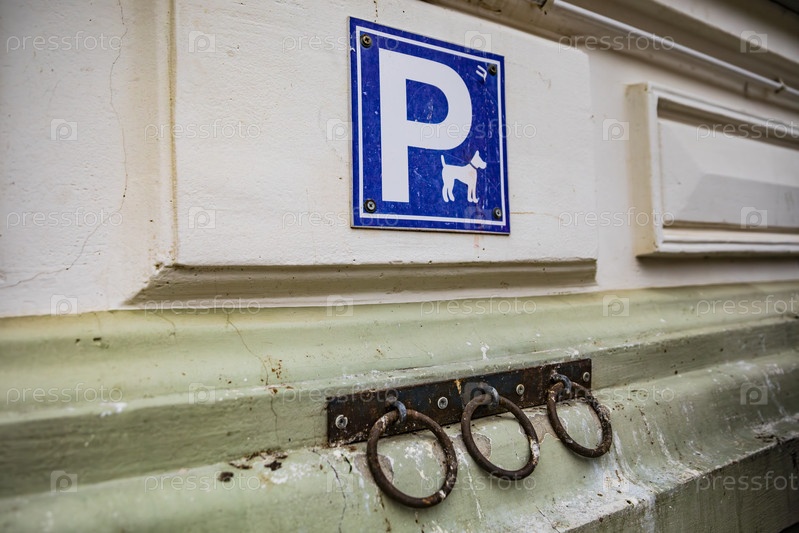 Синий знак парковки с символом собаки на стене