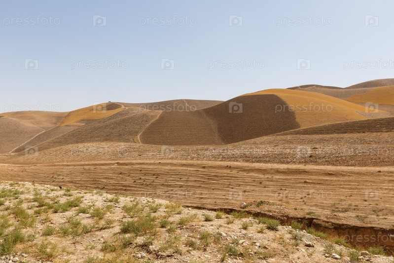 Холмистый пустынный ландшафт с оробленными полями в провинции Фариаб Афганистан под голубым небом